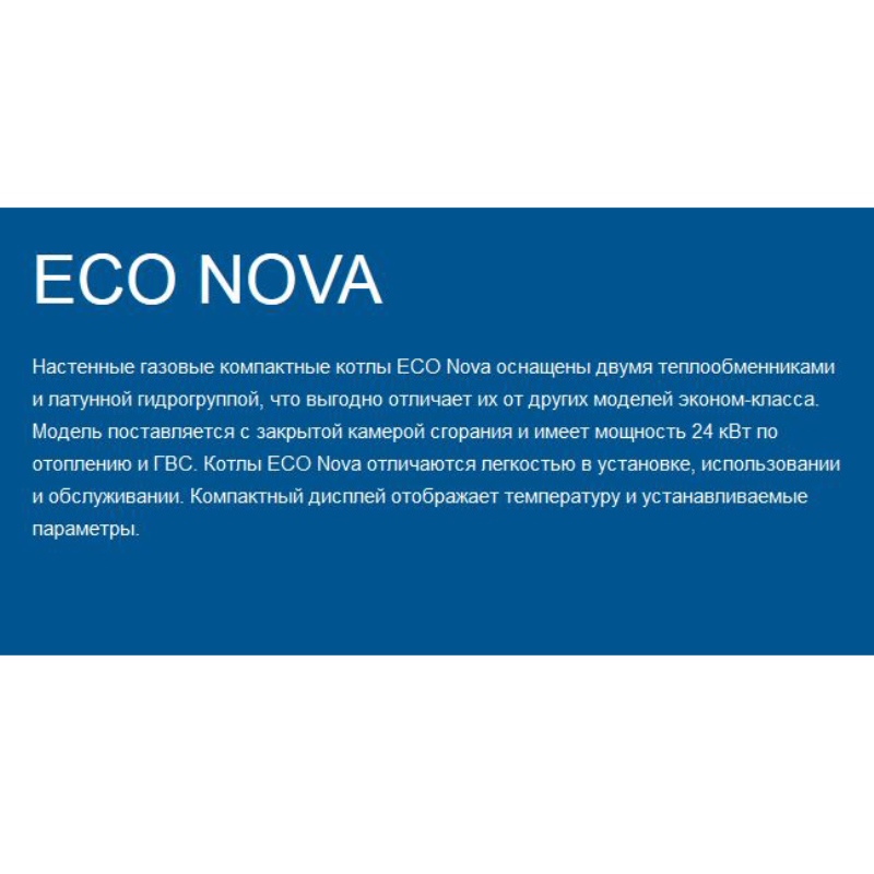 Настенные газовые котлы BAXI ECO NOVA поставляются в следующем комплекте: турбинный датчик протока горячей воды (расходомер), первичный медный теплообменник, покрытый специальным составом для дополнительной защиты от коррозии, энергосберегающий циркуляционный насос со встроенным автоматическим воздухоотводчиком, вторичный пластинчатый теплообменник из нержавеющей стали, латунный трехходовой клапан с электрическим сервоприводом, манометр, автоматический байпас, фильтр на входе холодной воды. К прибору отопления можно подключать комнатный термостат, программируемый таймер и системы удаленного управления через интернет.