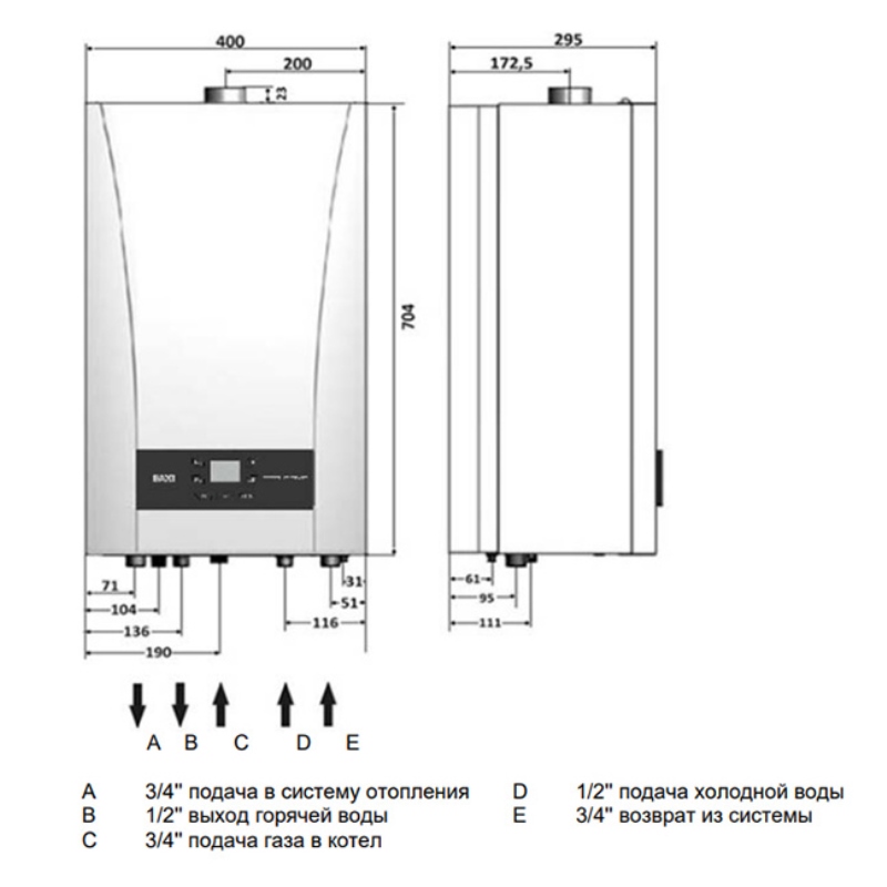 Настенные газовые котлы BAXI ECO NOVA поставляются в следующем комплекте: турбинный датчик протока горячей воды (расходомер), первичный медный теплообменник, покрытый специальным составом для дополнительной защиты от коррозии, энергосберегающий циркуляционный насос со встроенным автоматическим воздухоотводчиком, вторичный пластинчатый теплообменник из нержавеющей стали, латунный трехходовой клапан с электрическим сервоприводом, манометр, автоматический байпас, фильтр на входе холодной воды. К прибору отопления можно подключать комнатный термостат, программируемый таймер и системы удаленного управления через интернет.