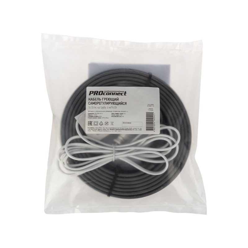 Комплект саморегулирующегося кабеля PROconnect мощностью 16 Вт/м используется для профилактики промерзания и образования наледи в бытовых трубопроводах, на счетчиках воды, вентилях и так далее. Подходит для использования как в помещениях, так и на улице. Нагревательный кабель соединен с питающим кабелем, на конце которого находится евровилка для подключения в розетку. В нормальных условиях его температура не превышает 65 °C.<br> Монтаж кабеля производится на поверхности металлической или пластиковой трубы, под теплоизоляцией. Фиксация кабеля обеспечивается алюминиевым скотчем или теплостойкой лентой. Может пересекаться сам с собой.<br> Подключение осуществляется через сеть 220 В.