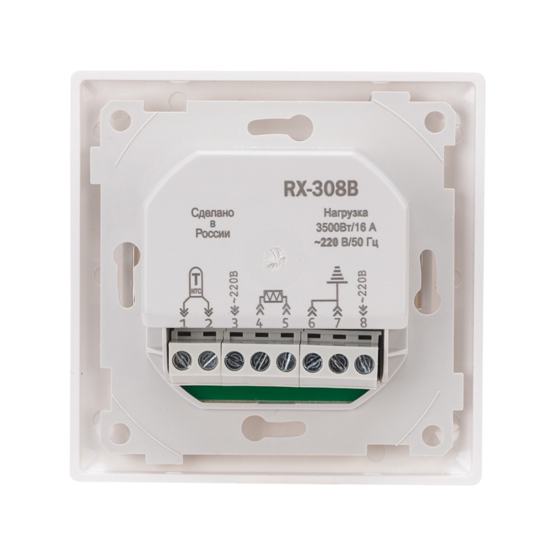 Электронный термостат RX-308B встраиваемый, корпус белый, диапазон регулировок +15°C/+45°C, коммутируемый ток контактов 16 А (3500 Вт), внешний датчик температуры 10 кОм.