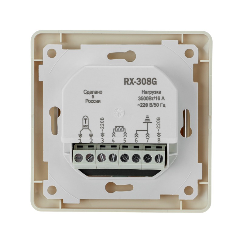 Терморегулятор RX-308G бежевого цвета представляет собой устройство, предназначенное для автоматического поддержания заданной пользователем температуры. Применяется в жилых и служебных помещениях при работе с нагревательными кабельными секциями и другими нагревательными приборами. Терморегулятор совместим с электроустановочными средствами Schneider серии Glossa.