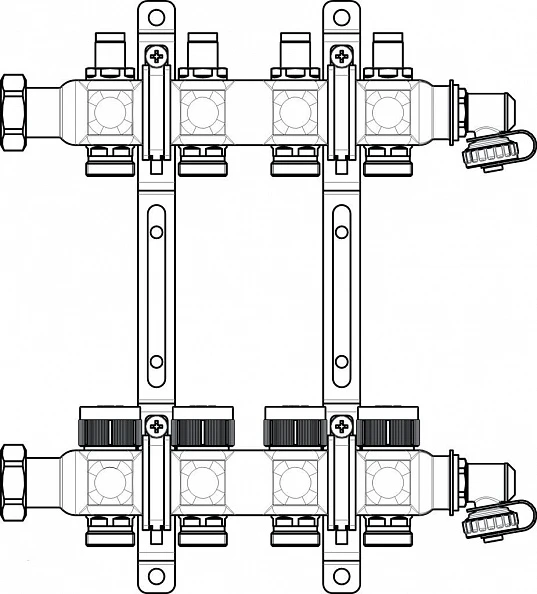 Коллектор состоит из подающей и обратной части коллектора, кронштейна для крепления со звукопоглощающими хомутами, бокового поворотного узла с воздухоотделителем, штуцера подачи /слива и заглушкой 3/4".