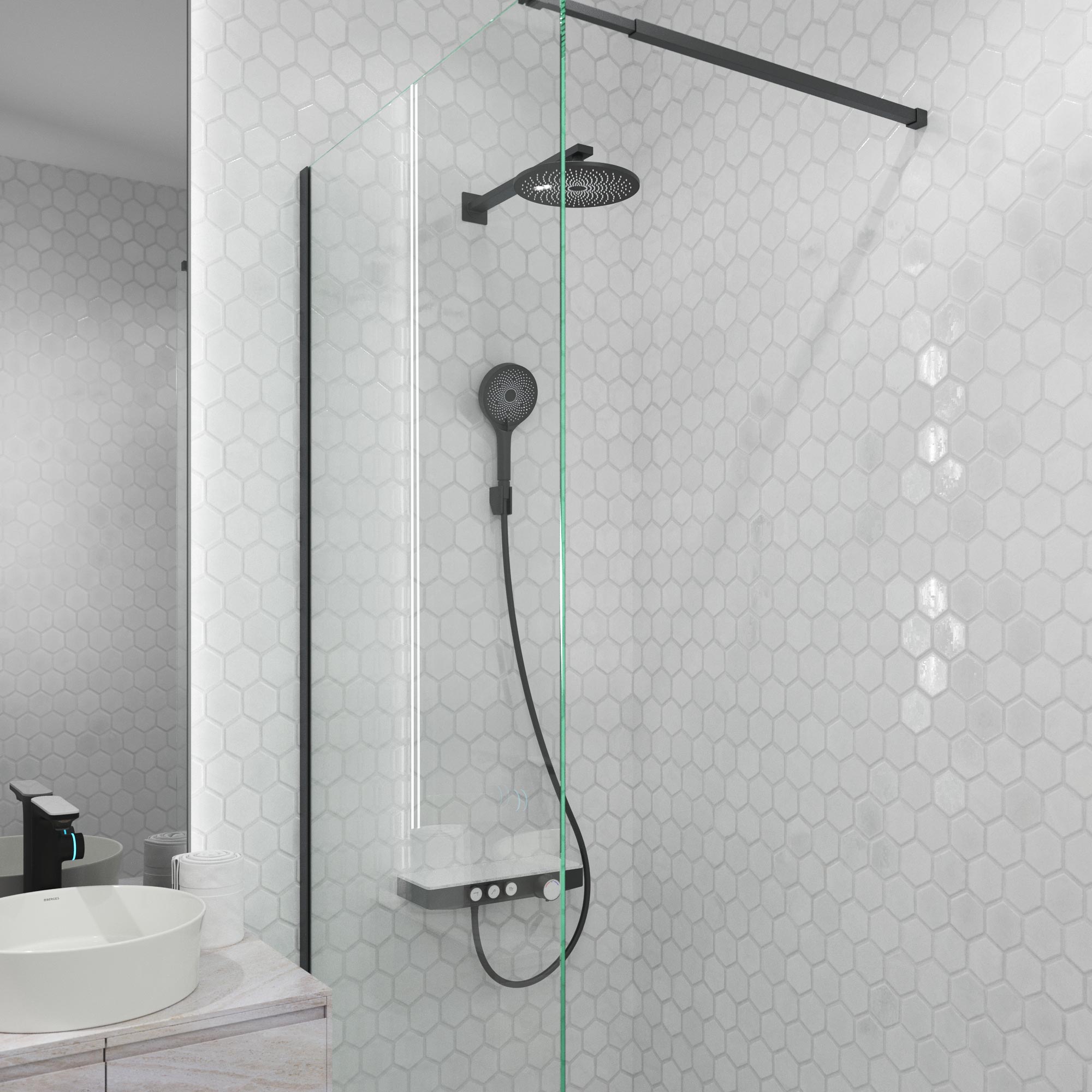 Форма корпуса смесителя выполнена в виде полочки из закаленного стекла, позволяя комфортно хранить необходимые принадлежности для душа.