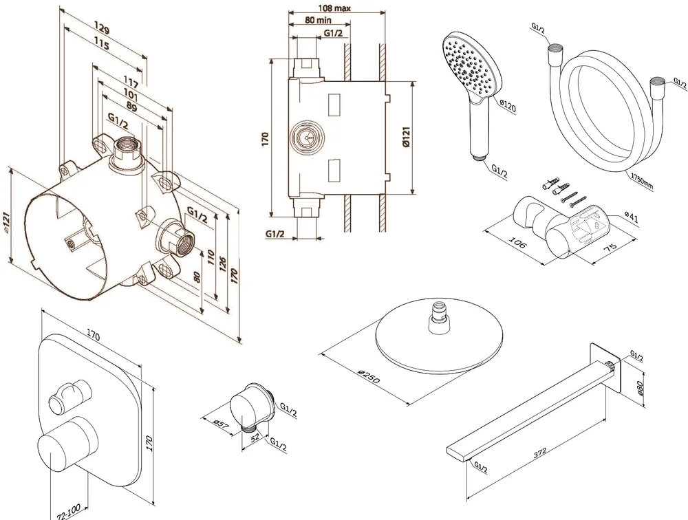 - Оснащение: Душевой шланг,Душевая лейка,Переключатель потоков,Кронштейн для верхнего душа,Крепления