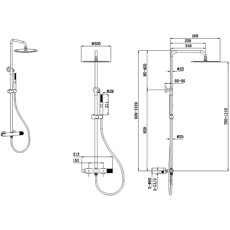 - Диаметр верхнего душа: 300 мм.
