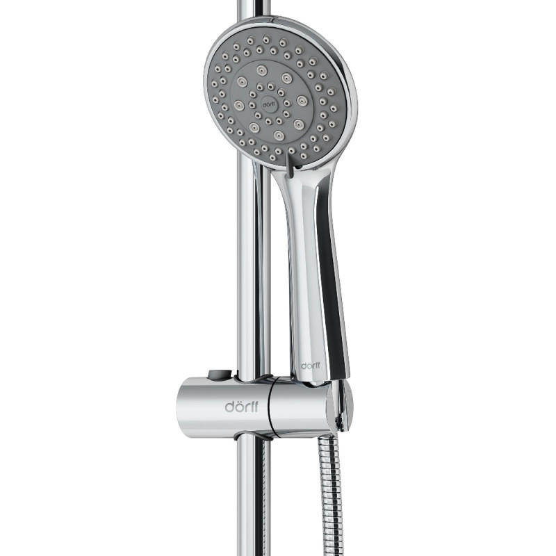Душевая система Dorff Norma D0710000 с тропическим душем, ручным душем с 5-ю функциями и длинным шлангом в 1750 мм. Немецкое качество, современный дизайн, многофункциональность, стойка с возможностью регулировки по высоте и шланг с защитой от перекручивания - станут приятным бонусом для тех, кто ценит эргономичность и функциональность.