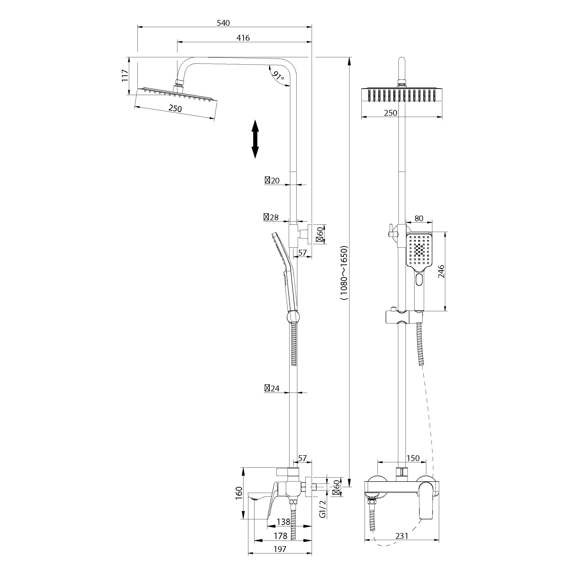 - Телескопическая душевая стойка позволяет изменять высоту до 165 см, что делает использование комфортным для людей разного роста.