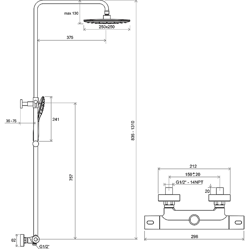 - Регулируемая высота душевой стойки: 850-1310 мм.