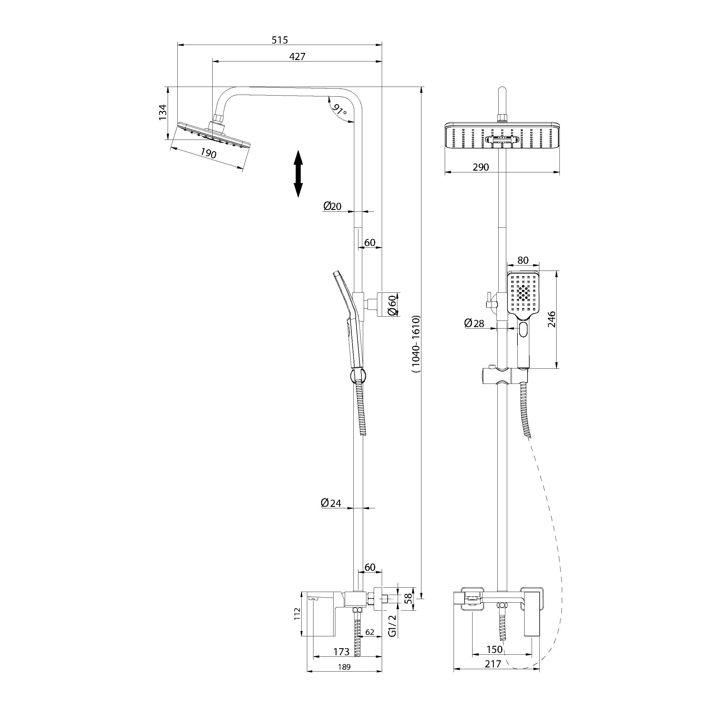 - Телескопическая душевая стойка позволяет изменять высоту до 165 см, что делает использование комфортным для людей разного роста.