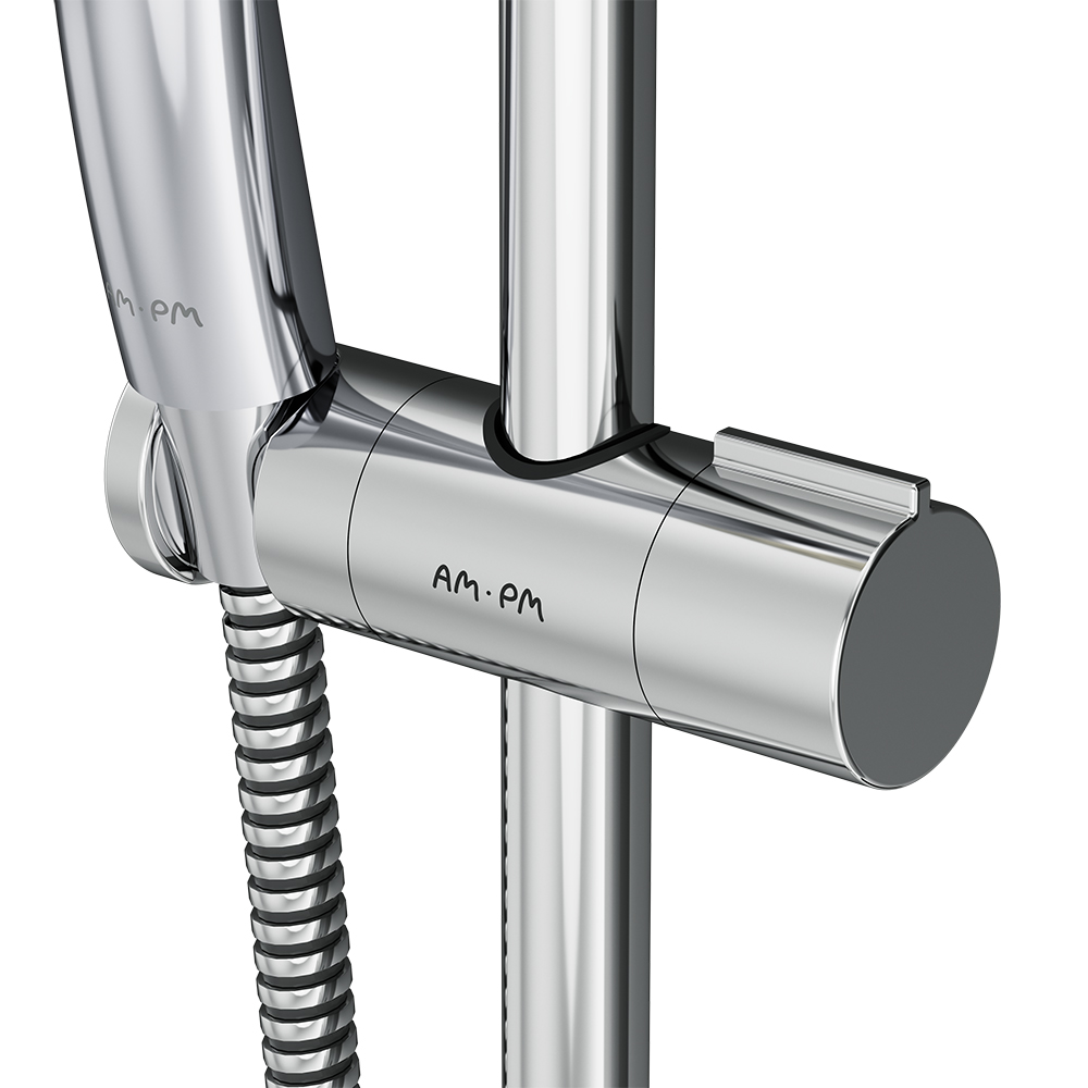 Продуманные детали для удобства использования: шарнирное соединение защищает душевой шланг от перекручивания регулируемый в трех плоскостях держатель ручного душа функция Rub&Clean для легкой очистки душевых форсунок.