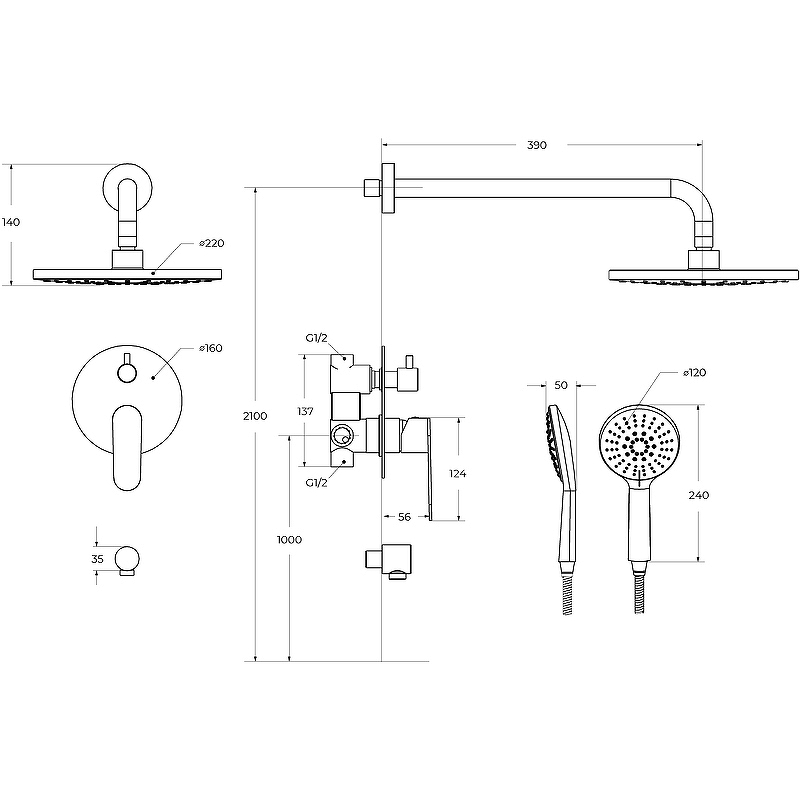 - Диаметр верхнего душа: 220 мм.