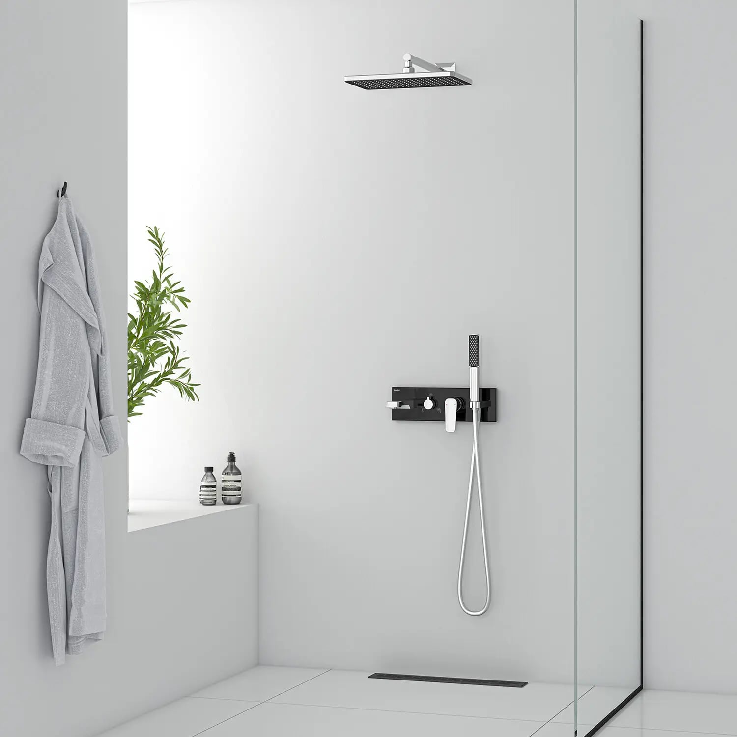 Втраиваемый смеситель Life с изливом, душевой лейкой и головным душем, черное стекло