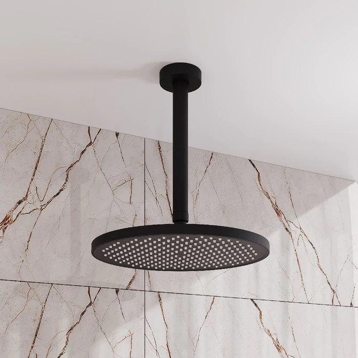 Черная матовая круглая верхняя лейка для тропического душа Esper станет отличным дополнением для встраиваемой душевой системы или заменит надоевшую лейку душевого гарнитура. За счет большого диаметра 256 мм лейка создает объемный поток воды, достаточный для комфортного принятия душа. Подходит ко всем кронштейнам со стандартным резьбовым соединением G 1/2”.