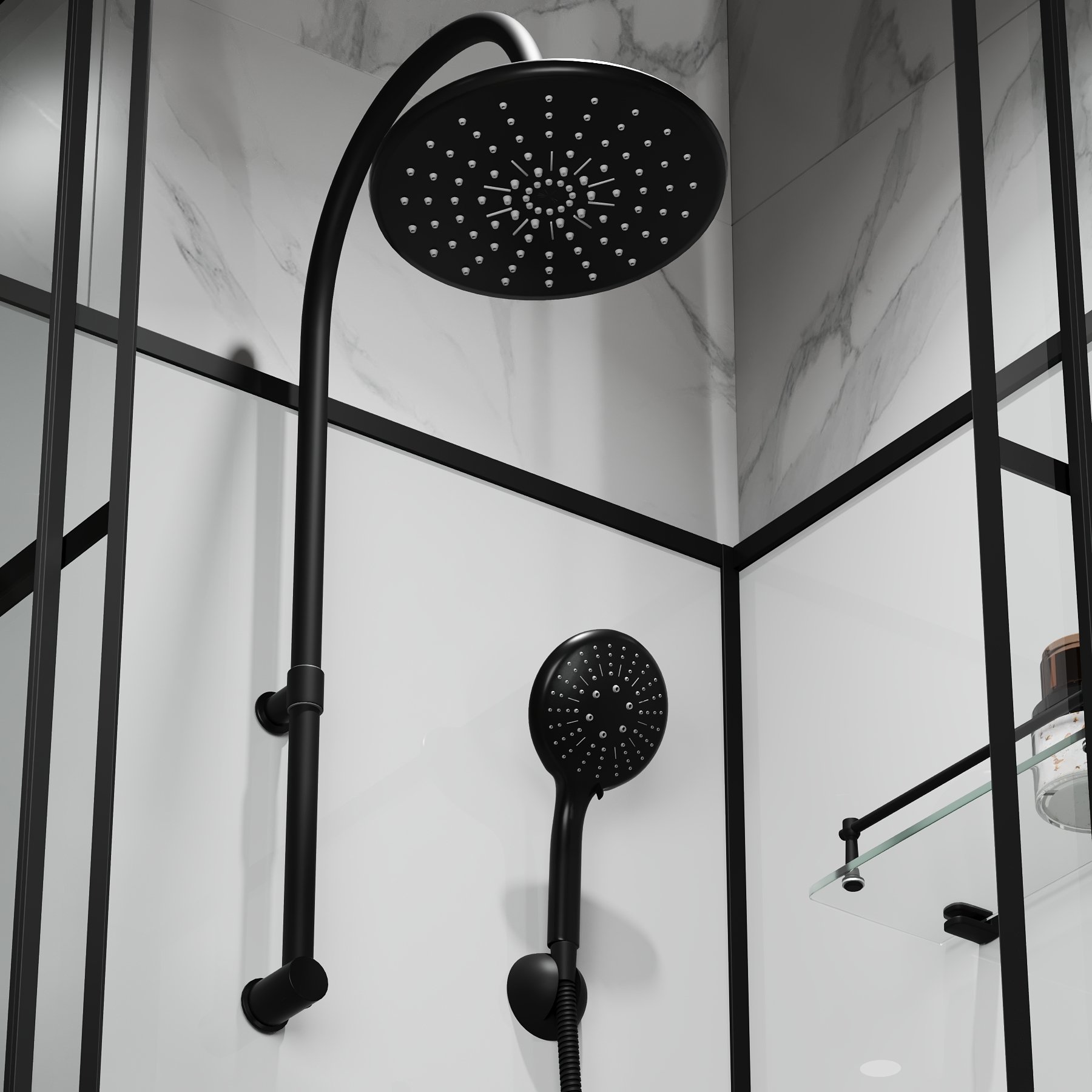 Профиль алюминиевый черный матовый. Остекление: закаленное стекло. Лицевые стела прозрачные 5 мм с рисунком клетка. Задние стенки белые крашенные 4 мм. Поддон низкий (15 см, глубина 2-4 см) усиленный, выдерживает нагрузку до 350 кг. Слив в углу, диаметр 5 см. Бессиликоновая сборка за счет дренажных каналов и бортиков. Вода не скапливается, что исключает образование плесени и грибков.