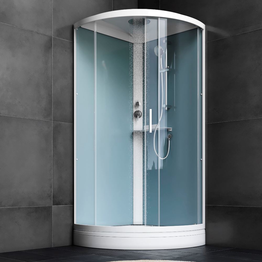 Качественные комплектующие: двойные металлические ролики, верхний душ, ручной душ с держателем с изменяемым углом наклона, удобная функциональная полка.