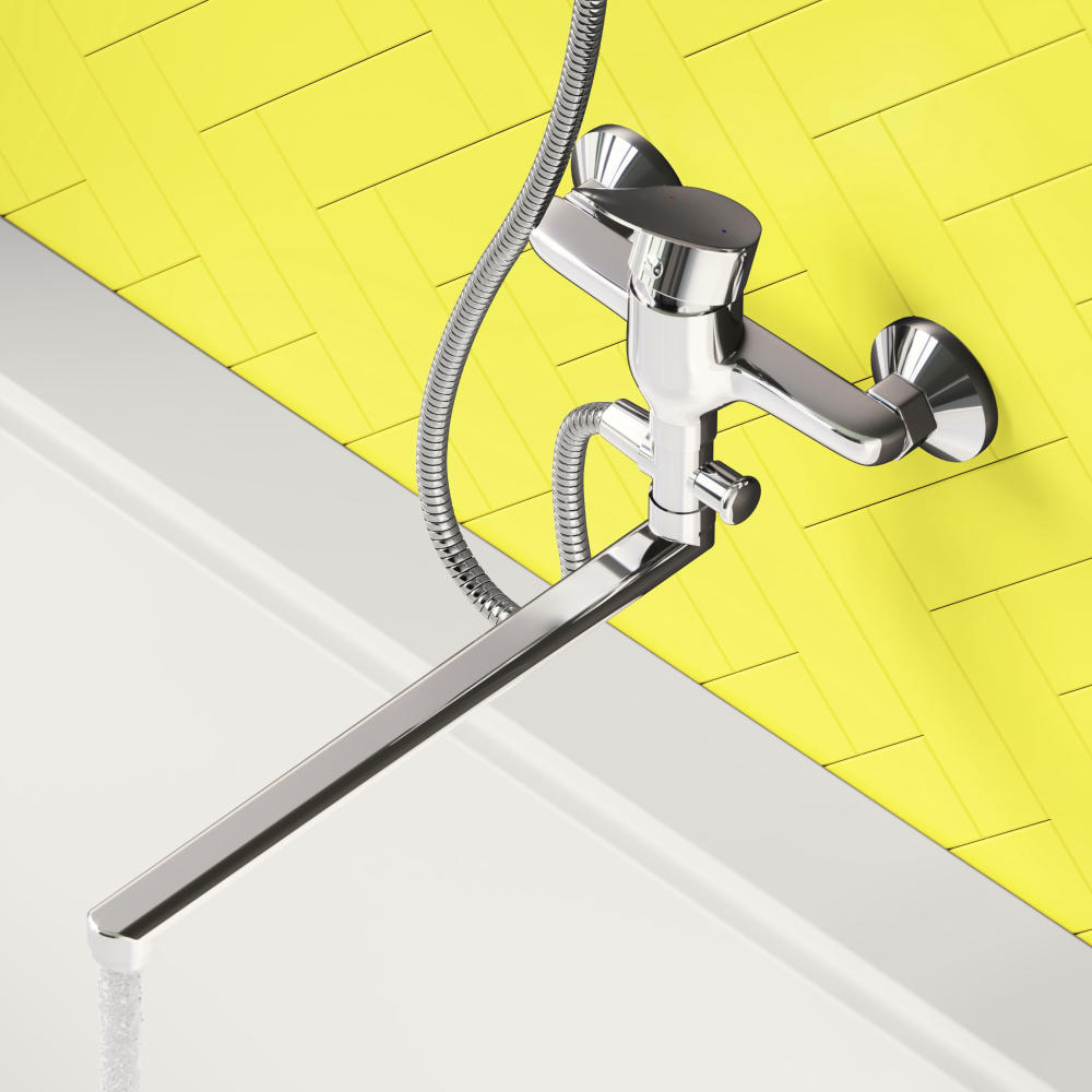 Универсальное решение для ванной комнаты - качественный смеситель для ванны и душа Norma с душевым набором и длинным поворотным изливом который позволяет использовать его как для ванны так и для рядом стоящей раковины.