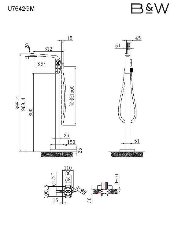 Смеситель для ванны Black&White Universe U7642GM 7642GM напольный с душевым гарнитуром.