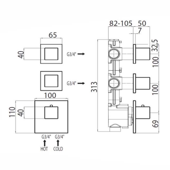 Bossini Встр. часть термостата с 2 запорными клапанами, (2 выхода) высокой пропускной способности на ¾”, уст-ка верт/гор.