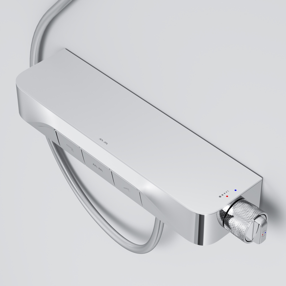Интуитивно понятное управление: всего одна удобная ручка для настройки температуры и потока воды. Благодаря специально спроектированной эргономичной ручке вы можете управлять душевым смесителем даже с мыльными руками. Переключение потоков воды осуществляется нажатием клавиши. Комбинированный способ управления и вариативность функций делают смеситель одним из самых удобных на рынке.
