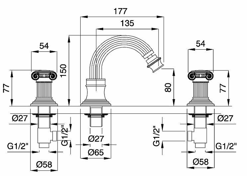 - Декорированные округлой формы ручки позволяют точно регулировать температуру и напор воды.