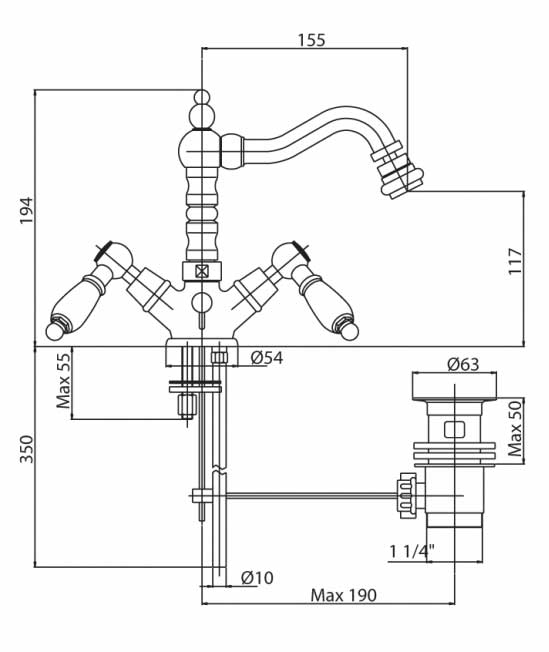 Донный клапан: G 1 1/4. Рычаг управления на корпусе смесителя.