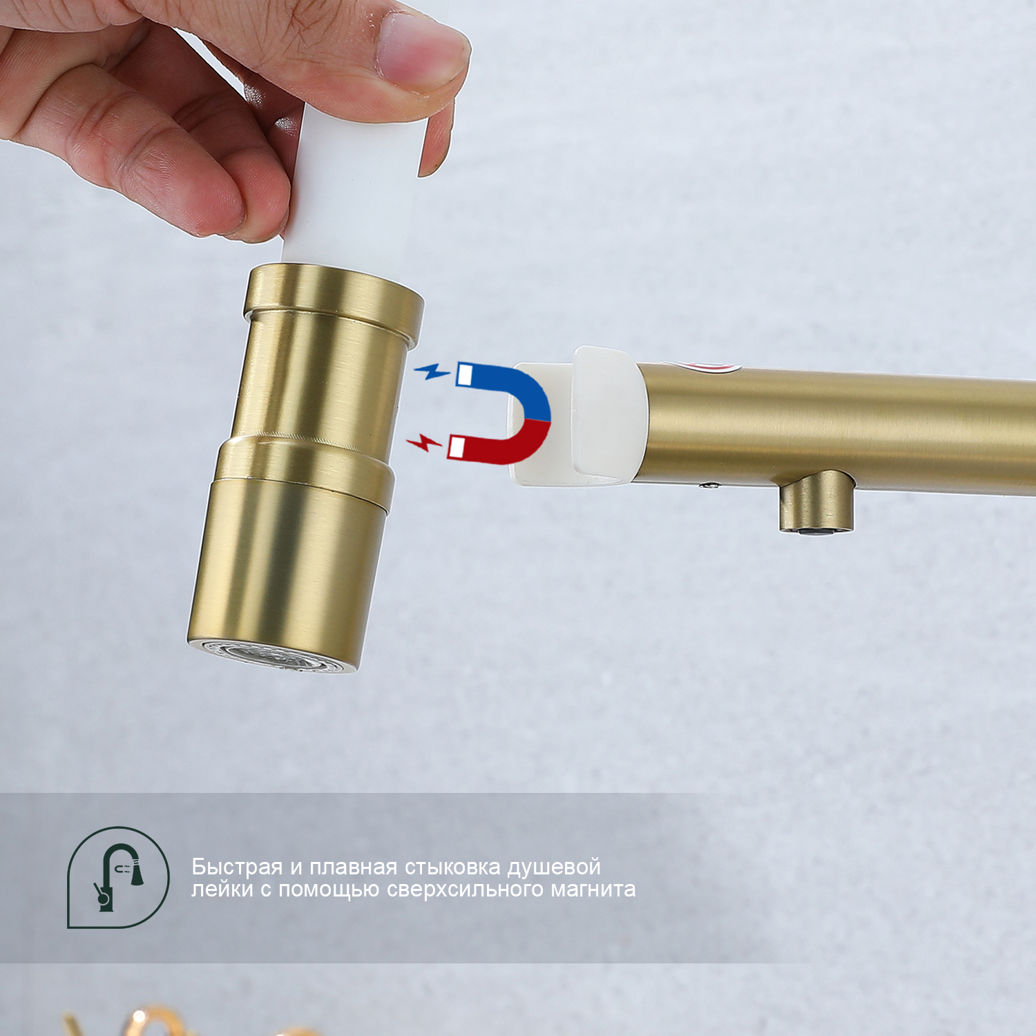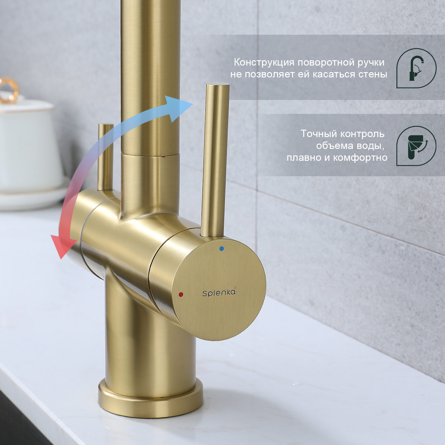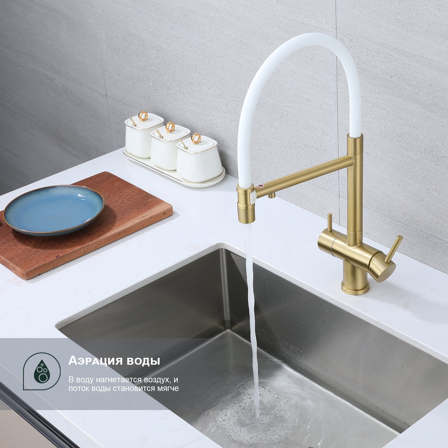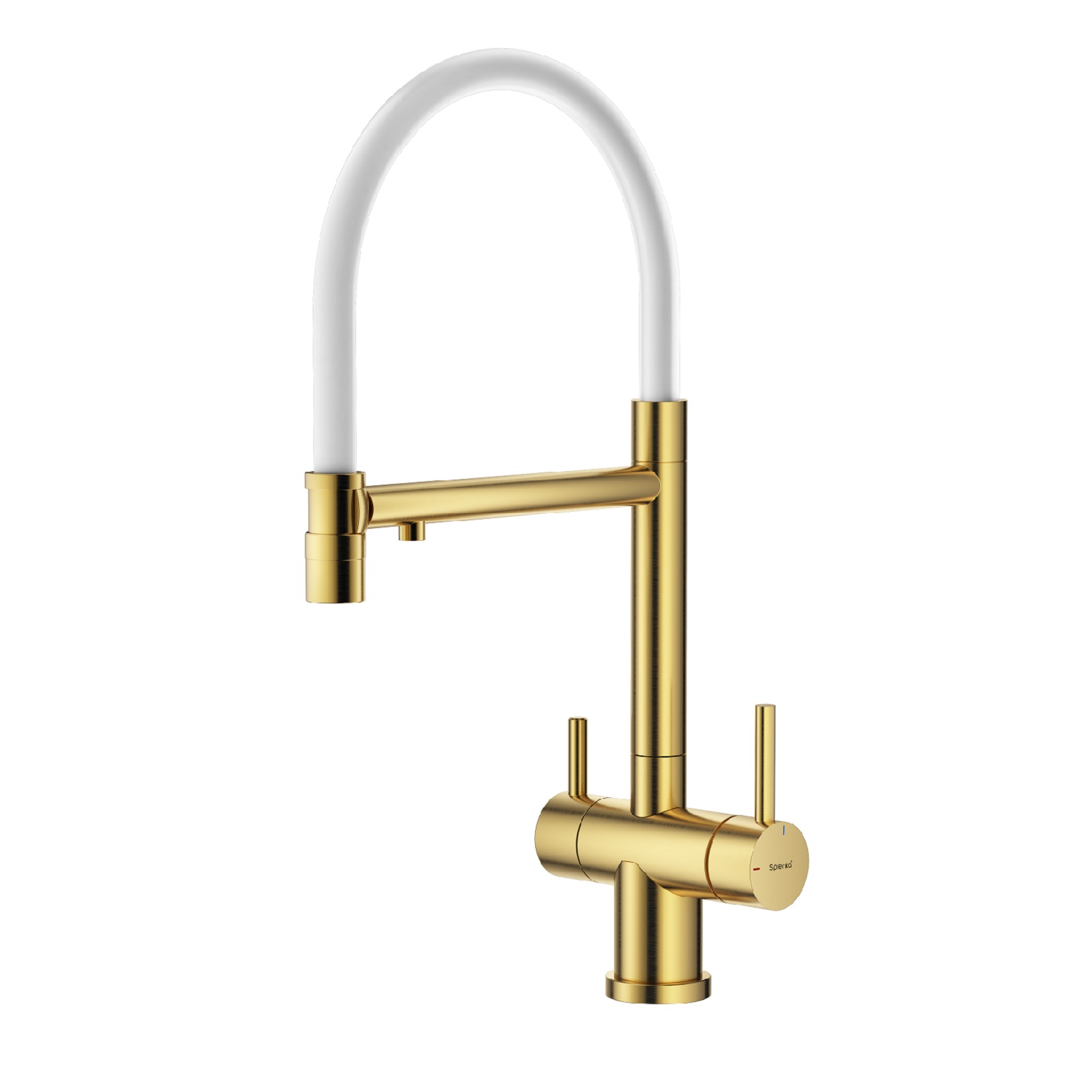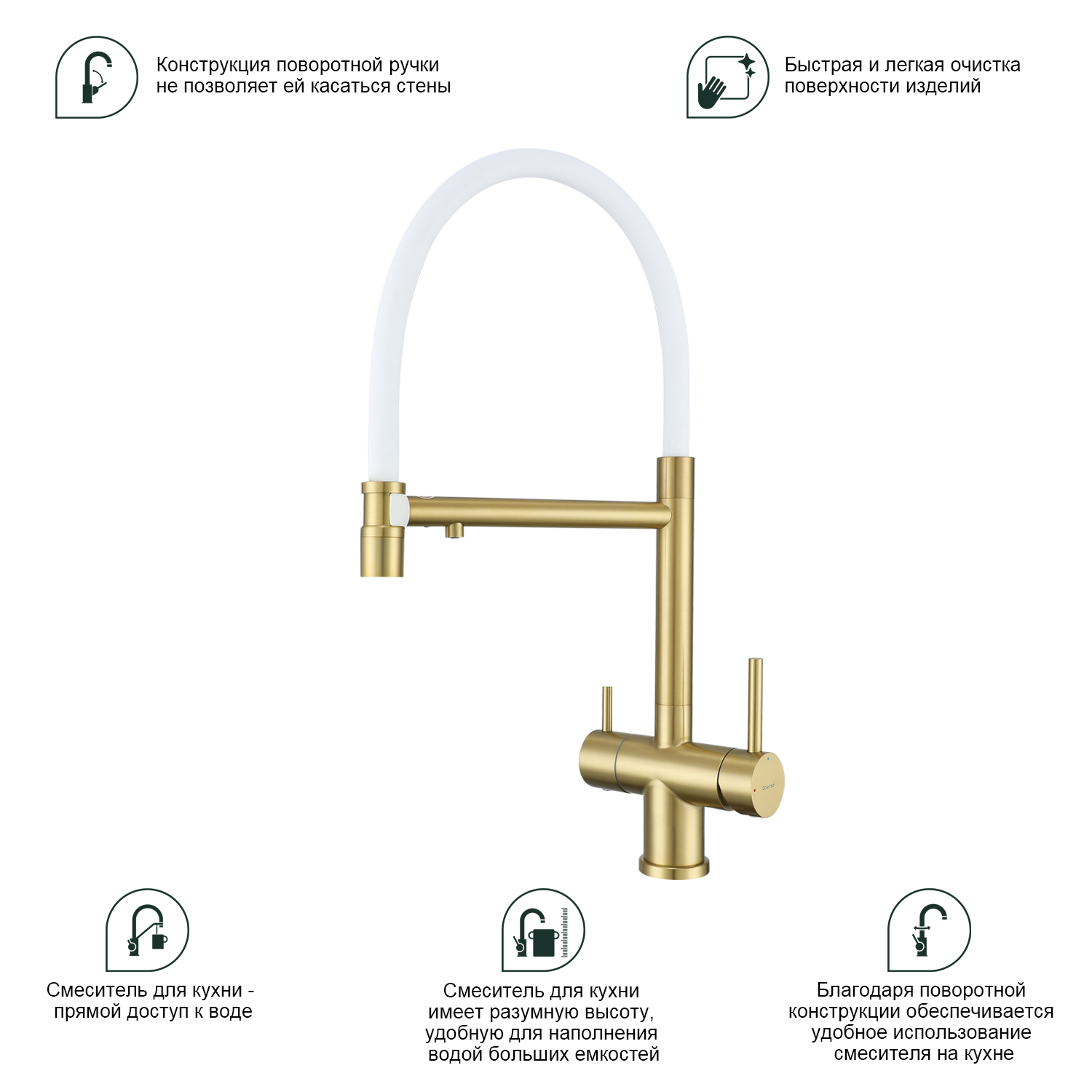Splenka S70.63.03 Смеситель для кухни со съемным изливом на магните и подключением фильтра питьевой воды. Смесители для кухни с гибким изливом имеют необычный внешний вид и особую конструкцию. Нижняя часть представляет собой обычный однорукий латунный смеситель с регулировкой холодной и горячей воды, регулировкой напора и переключателем на фильтр с другой стороны. Верхняя часть это гибкий излив из пищевого силикона. С его помощью можно самостоятельно регулировать глубину выноса и высоту излива, что решает проблему при наполнении раковины посудой. Смеситель поворачивается на 360 градусов и оснащен отдельным выходом для фильтрованной воды. Переключение на воду из фильтра осуществляется переключателем с керамическим картриджем.
