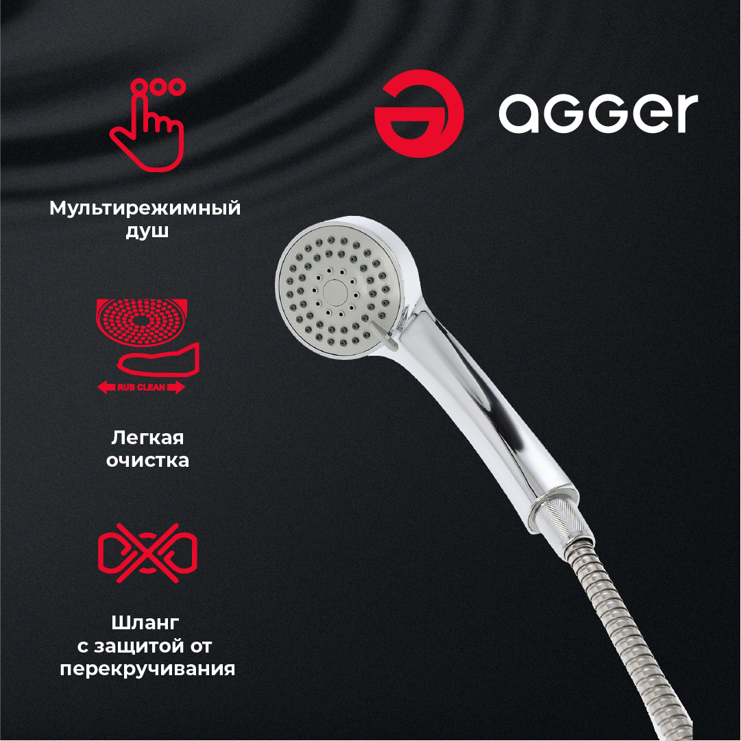 Однозахватный смеситель для ванны/душа с универсальным изливом и душевым набором Agger Clean – стильное, удобное и надежное сантехническое оборудование, которое станет идеальным решением для современной ванной комнаты. Корпус выполнен из высококачественной латуни, не подверженной коррозии от длительного контакта с водой. Фирменный картридж Agger делает лёгким управление напором и температурой воды, а керамический дивертор переключит её направление с излива на душ даже при низком давлении. Хромированное покрытие, за которым очень просто ухаживать мягкой салфеткой, обеспечит блеск поверхности на долгие годы. Аэратор экономит воду и, обогащая струю воздухом, делает её мягкой и без брызг. В комплекте душевой набор: ручная лейка d68 мм (1 режим), душевой шланг 1500 мм в металлической оплетке (с защитой от перекручивания) и настенный держатель лейки.