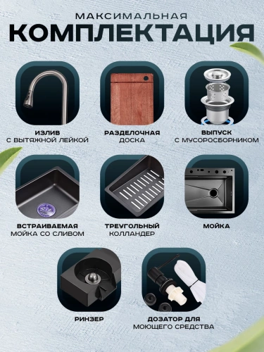 Мойка: материал нержавеющая сталь 0,8 мм., поверхность матовая, цвет графит