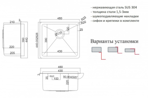 ВАЖНО ! Возможны три варианта установки мойки : сверху на столешницу, снизу под столешницу, вровень со столешницей.