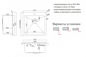 ВАЖНО ! Возможны три варианта установки мойки : сверху на столешницу, снизу под столешницу, вровень со столешницей.