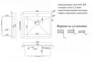 ВАЖНО ! Возможны три варианта установки мойки : сверху на столешницу, снизу под столешницу, вровень со столешницей.