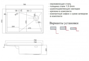 1. Верхний кант мойки выполнен из нержавеющей стали толщиной 3 мм и скосом 45 градусов (фацет), что позволяет мойке идеально прилегать к столешнице и иметь эстетичный внешний вид.. 2. Чаша мойки выполнена из нержавеющей стали толщиной 1.5 мм.