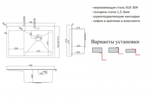 ВАЖНО ! Возможны три варианта установки мойки : сверху на столешницу, снизу под столешницу, вровень со столешницей.