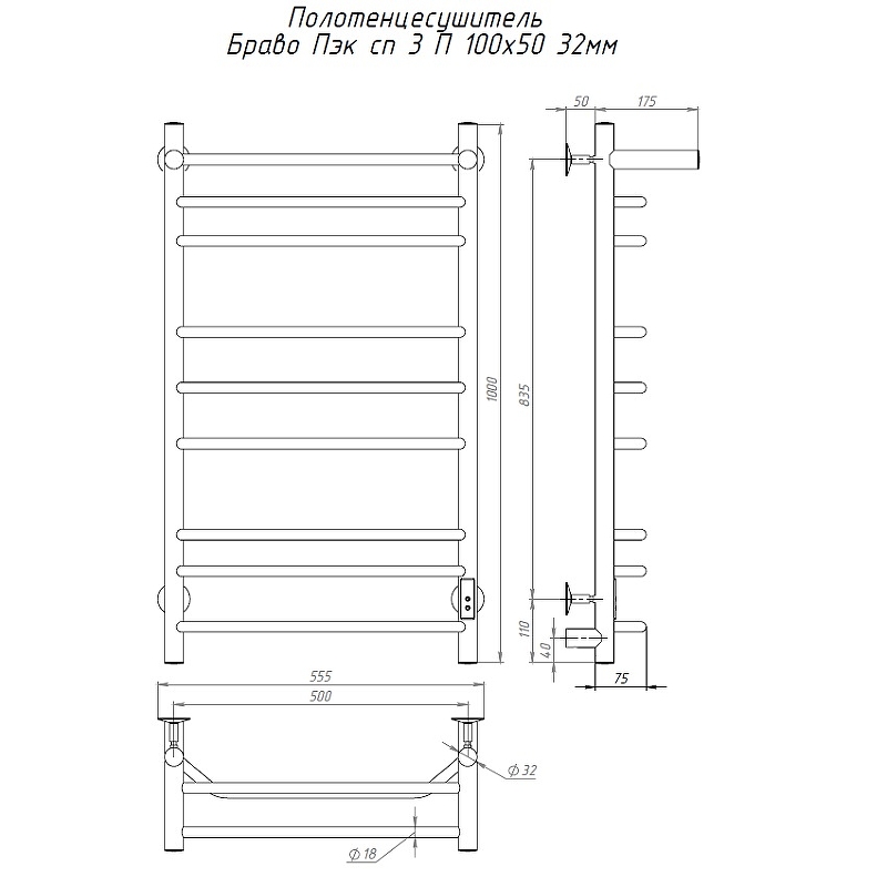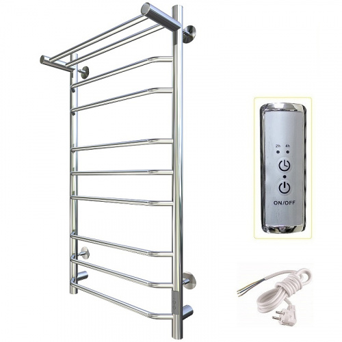 Электрический полотенцесушитель Тругор Браво Пэк СП 3 П 100x50 с полкой в цвете хром - это незаменимый помощник в вашей ванной комнате. Он не только просушивает влажные вещи и полотенца, но и дополнительно обогревает помещение.<br/><br/>Полотенцесушитель выполнен из пищевой нержавеющей стали марки AISI 201, которая отличается стойкостью к высоким температурам и коррозии. Форма полотенцесушителя - лесенка с 10 перекладинами. Высота устройства составляет 100 см, а ширина - 53,2 см.<br/><br/>Теплоноситель в полотенцесушителе - сухой (нагревательный кабель), что обеспечивает безопасность использования и отсутствие вероятности замерзания теплоносителя. Мощность устройства составляет 100 Вт.<br/><br/>В полотенцесушителе встроен выключатель с таймером на 2 и 4 часа, что позволяет экономить электроэнергию. В комплект скрытого подключения входит распаячная коробка.<br/><br/>В комплекте поставки вы найдете полотенцесушитель, телескопический держатель (4 шт.), комплект скрытого подключения, нагревательный кабель, выключатель с таймером, шнур электропитания с вилкой и паспорт изделия.<br/><br/>Электрический полотенцесушитель Тругор Браво Пэк СП 3 П 100x50 с полкой - это надежное и функциональное решение для вашей ванной комнаты.