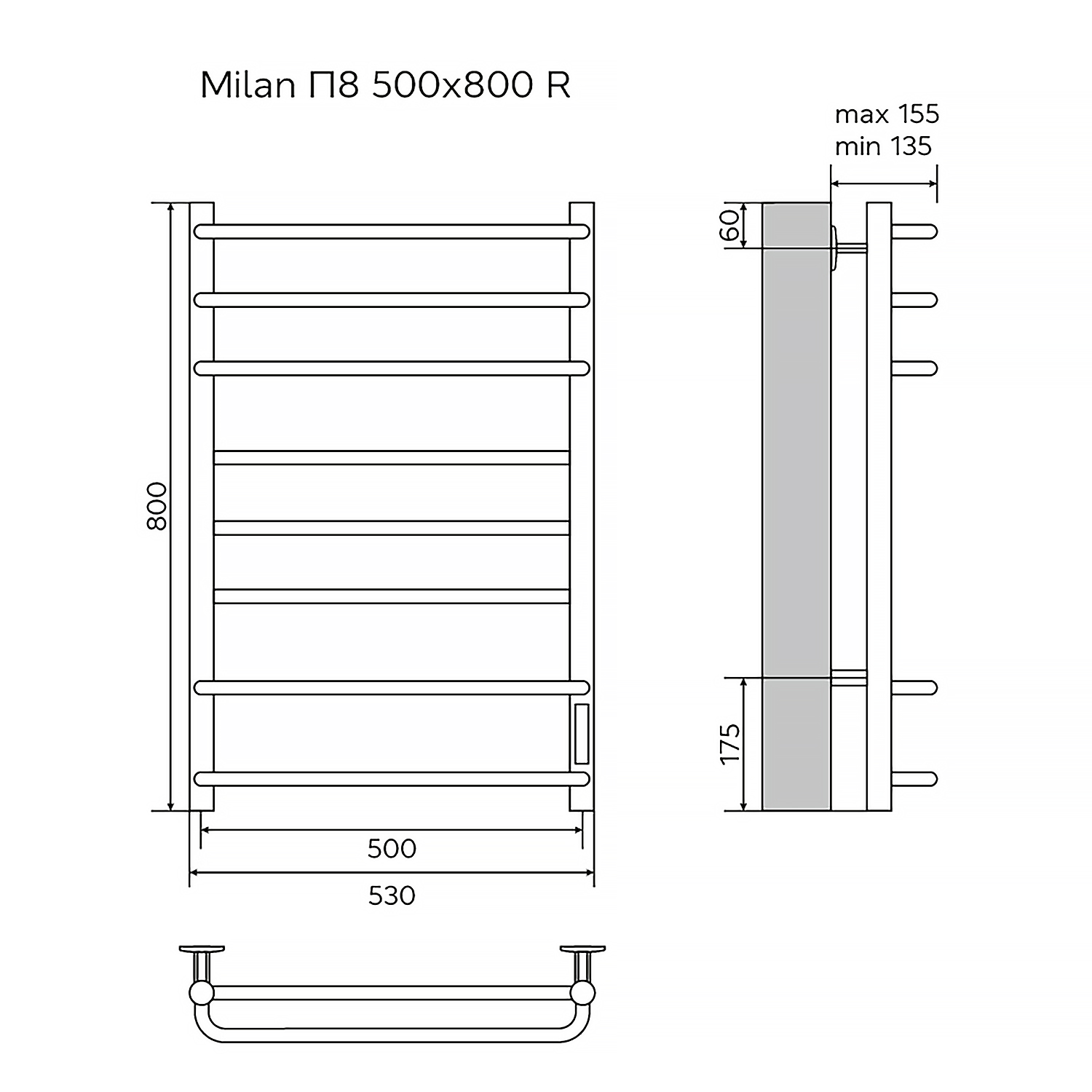 Полотенцесушитель электрический AZARIO MILAN 500/800 8 секций, диммер справа, черный (AZ90858B)