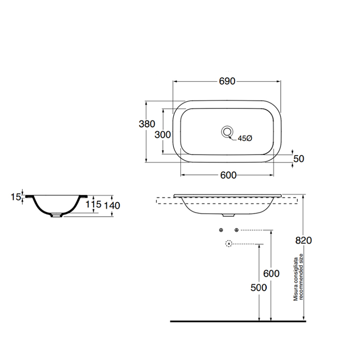 AZZURRA GLAZE Раковина встраиваемая на столешн. без отв. под смеситель 69x38см, цвет белый
