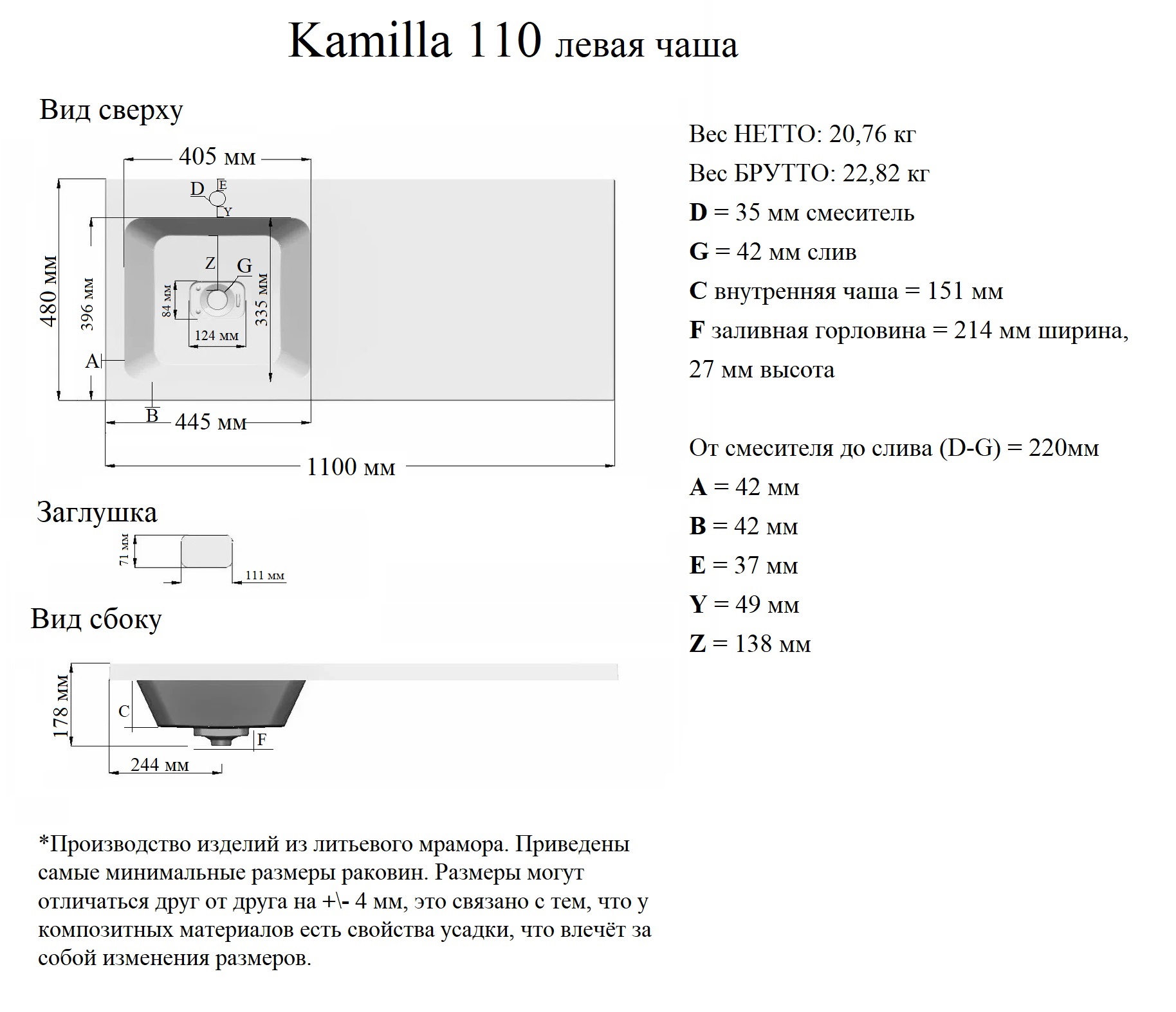 Раковина Камилла 110 (Madera) специально предназначена для тумбы ВИЛАР-50 ТМ Grossman. Чаша распологается с левой стороны от стиральной машины. Изготовлена из литьевого мрамора, отверстие под смеситель находится по центру чаши. В комплект к раковине входит: кронштейн и декоративная крышка из искуственного камня. Чаша обработана декоративным защитным покрытием, устойчивым к загрязнениям и механическим повреждениям.Устойчива к агрессивным химическим веществам. Выполнена в лаконичном стиле, впишется в современный интерьер. Стиральная машина до 470 мм.