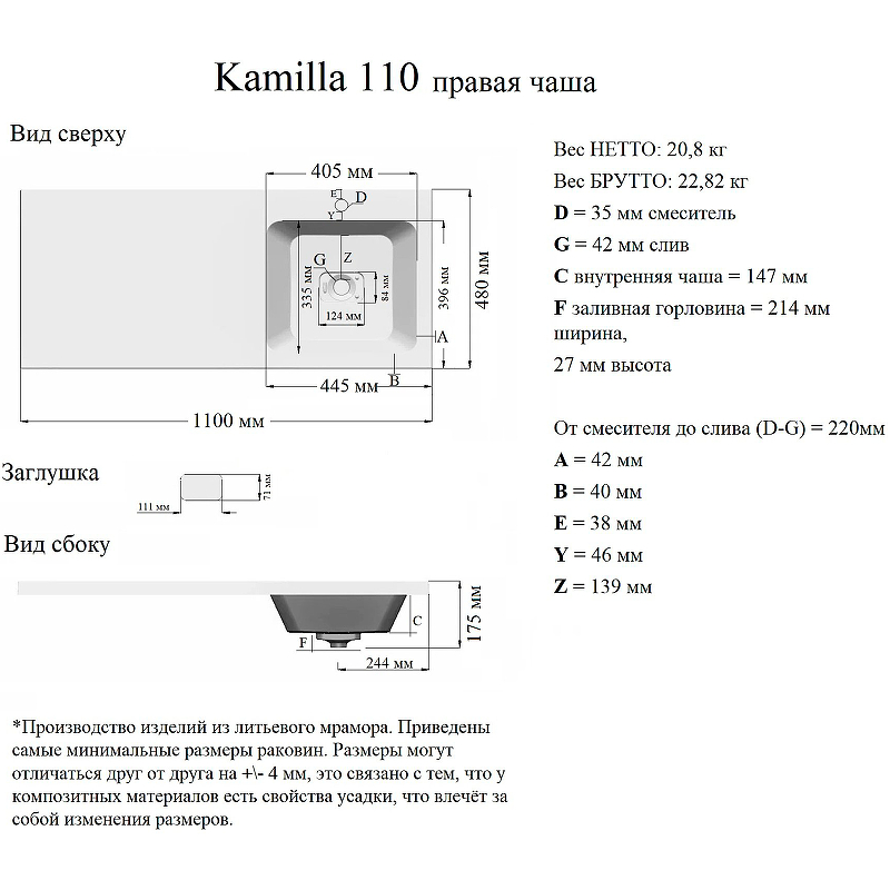 - Материал: литьевой мрамор.
