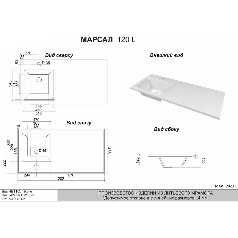 <p>Раковина Grossman Marko Марсал 120 L 5217121 на стиральную машину.<p>Характеристики:</p><ul><li>Цвет: белый.</li><li>Материал: литьевой мрамор.</li><li>Размеры (ШхВхД): 1202х150х486 мм.</li><li>Форма: прямоугольная.</li><li>Отверстие под смеситель: 1.</li><li>Ориентация: левосторонняя.</li><li>Монтаж: подвесной на стиральную машину.</li></ul><p>В комплекте поставки:</p><ul><li>Чаша раковины.</li><li>Кронштейн: 1 шт.</li></ul></p>