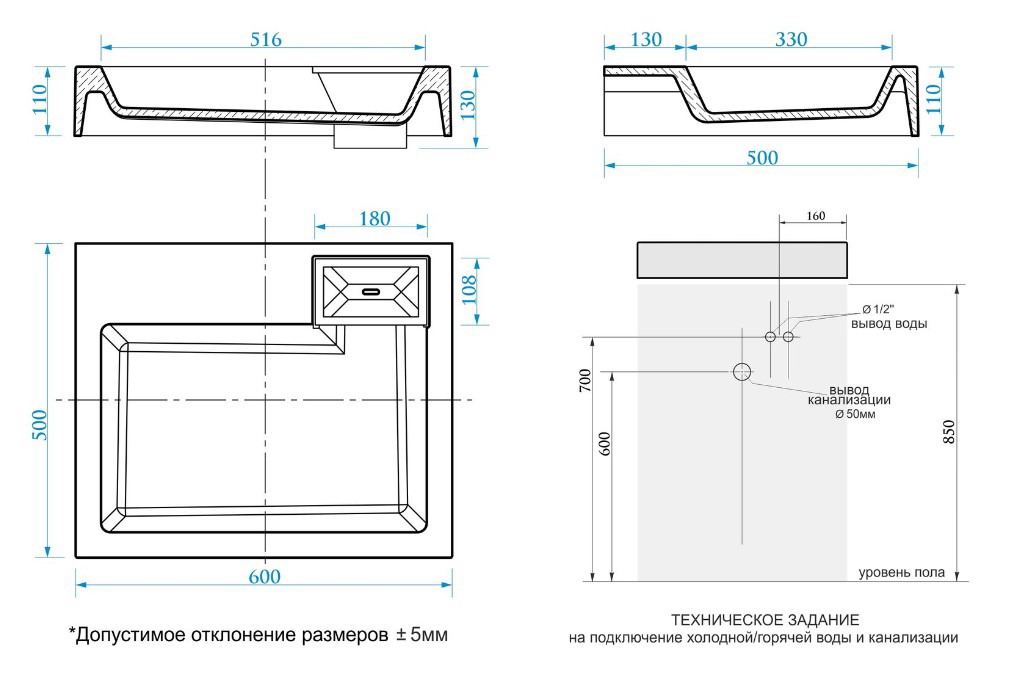 Раковина Azario Etna NEW 600х500х100 литьевой мрамор, сифон в комплекте, белая (CS00086607)