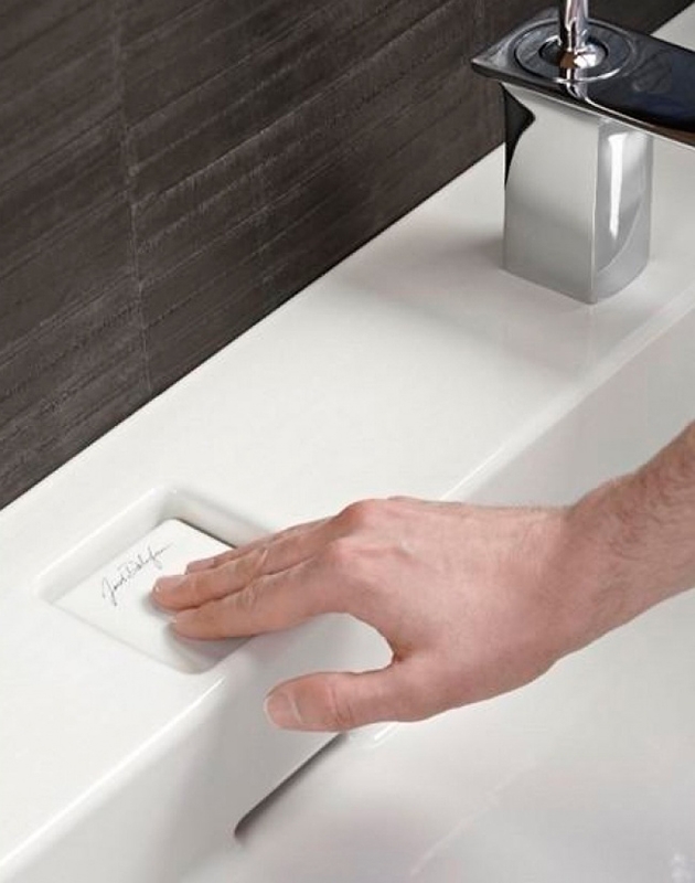 - Инновационная система слива FreeDrain: сливное отверстие находится на задней стенке раковины. Простое нажатие на кнопку закрывает отверстие слива и раковина наполняется водой.