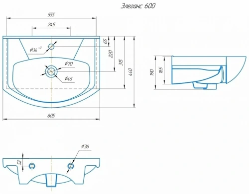 <b>РАКОВИНА ПРОДАЕТСЯ ТОЛЬКО В КОМПЛЕКТЕ С ТУМБОЙ RUNO</b><br> Умывальник Элеганс 60 - полувстраиваемый, монтируется на тумбу, с возможностью крепления к стене. Полукруглая форма раковины оптимальных размеров: шириной 60,5 см, глубиной 44 см, высотой 19 см. Материал раковины - фаянс с максимально гладкой поверхностью.