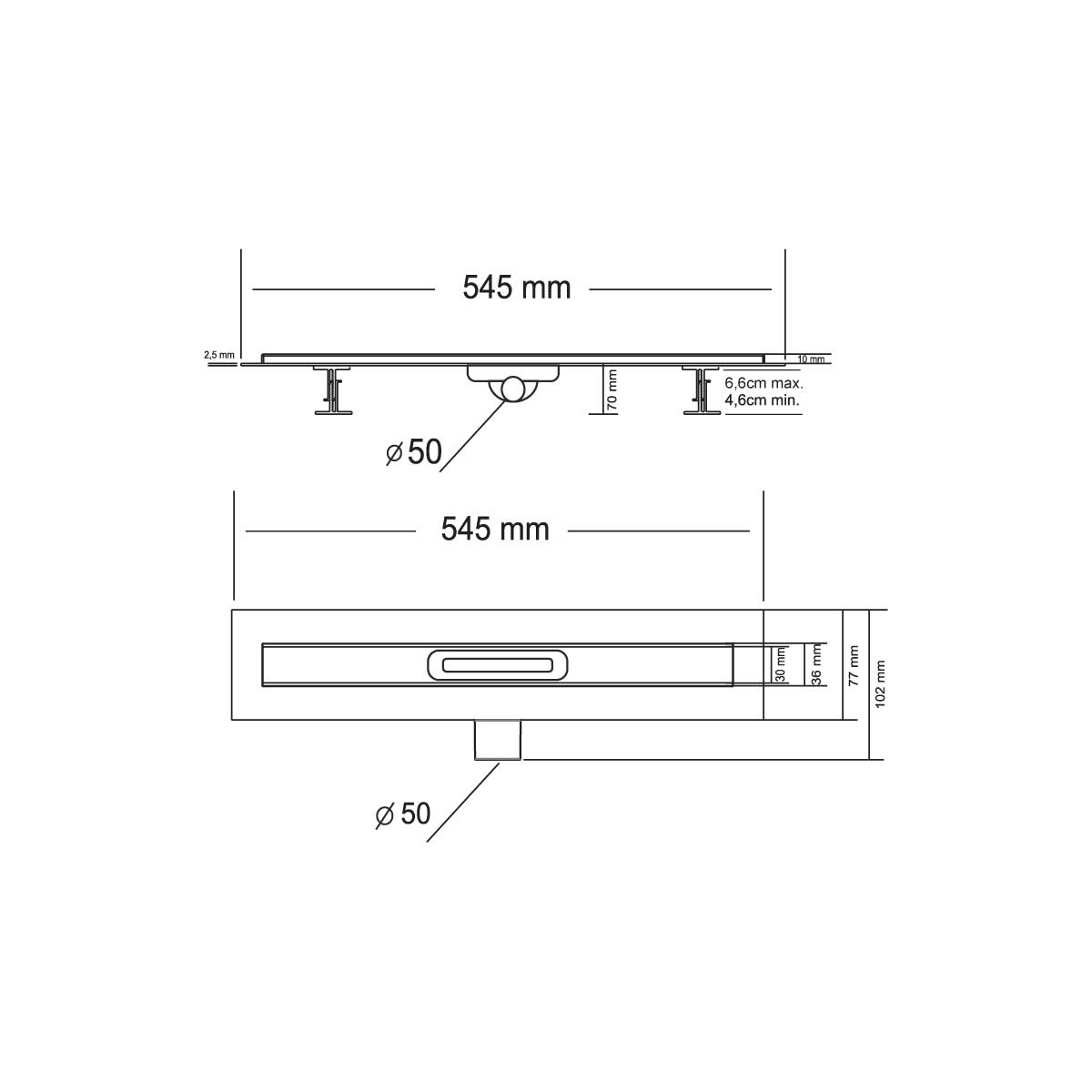 Дренажный канал из ABS-пластика, противозапаховый затвор, решетка из нержавеющей стали 1 мм, комплект регулируемых по высоте опор, пластиковый сервисный ключ.