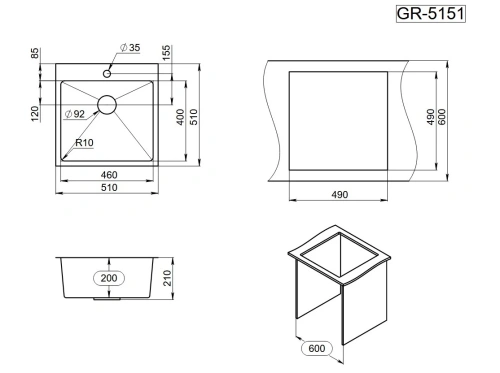 Кухонная мойка GRANULA (5151, ГРАФИТ МАТОВЫЙ)