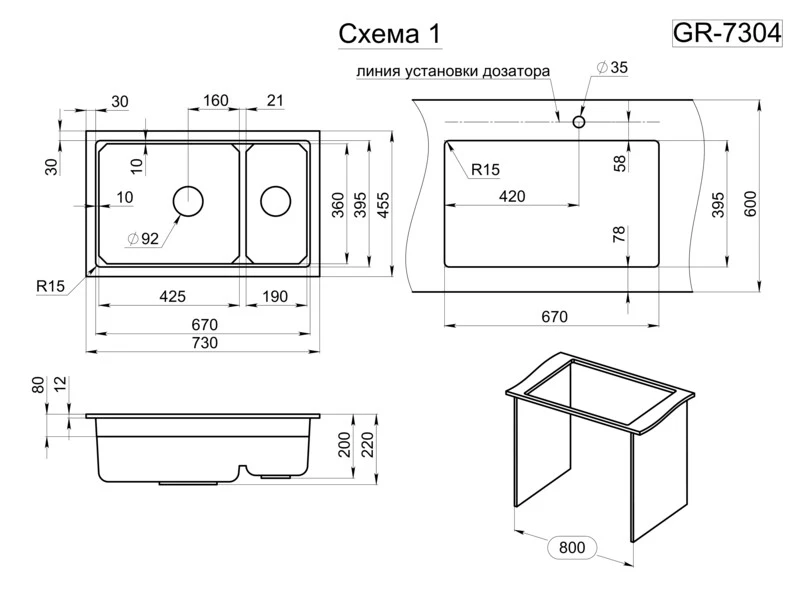 Мойка российского производителя Granula. Двухсекционная кухонная мойка прямоугольной формы для установки под столешницу в шкаф 800мм. Представляет собой инновационный комплекс с удобной площадкой внутри чаши для установки ролл-мата или разделочной доски. Выполнена из кварцевого композитного материала высокой плотности и гигроскопичности, что обеспечивает не менее 20 лет надежной эксплуатации. Ролл-мат и дозатор из нержавеющей стали идут в комплекте.<br>