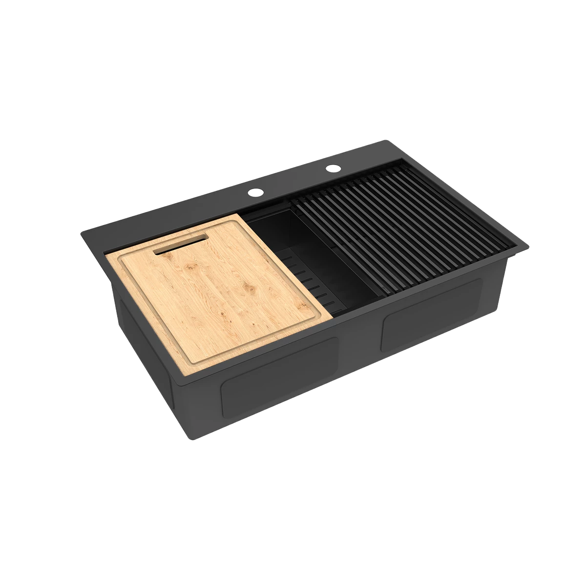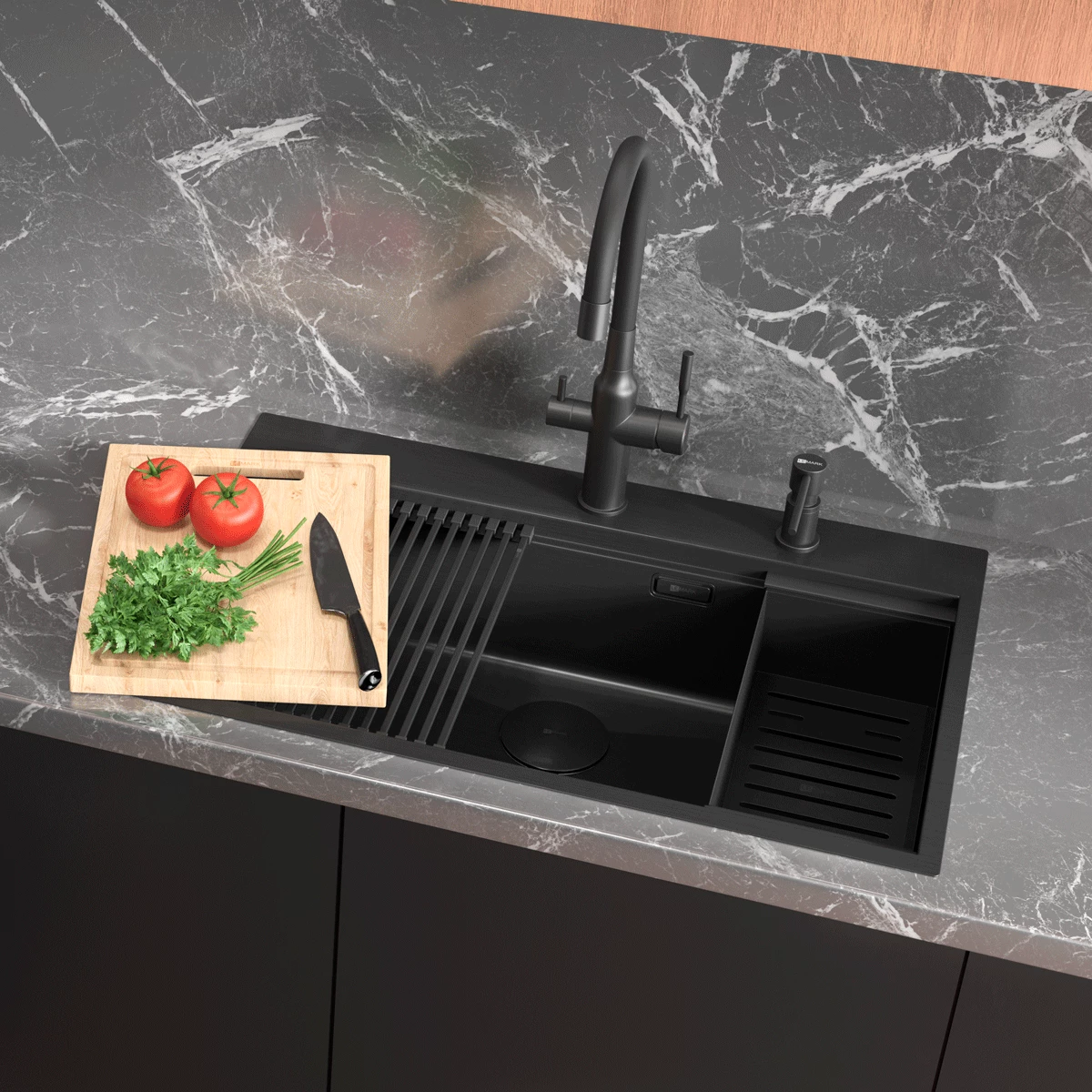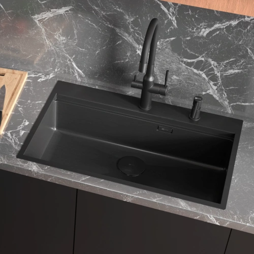 Кухонная мойка Lemark IORDANA 780 прямоугольная из нержавеющей стали с аксессуарами в комплекте: ролл-мат, коландер, разделочная доска цвет: чёрный матовый (9932120)