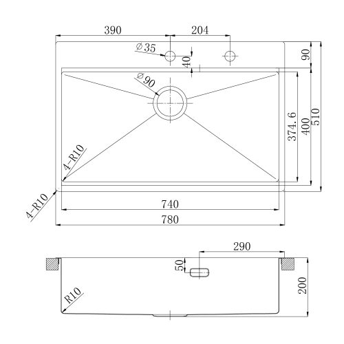 • Сливная арматура с выпуском 3 ½ (D-90мм) и сифон с возможностью подключения посудомоечной и стиральной машины