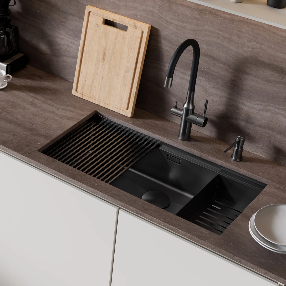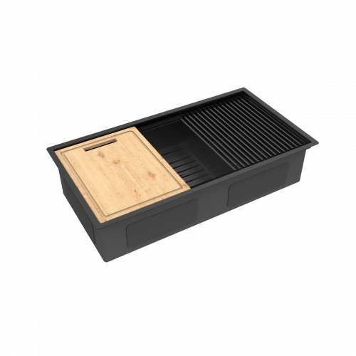 Кухонная мойка Lemark TABAGA 820 прямоугольная из нержавеющей стали с аксессуарами в комплекте: ролл-мат, коландер, разделочная доска цвет: чёрный матовый (9932136)