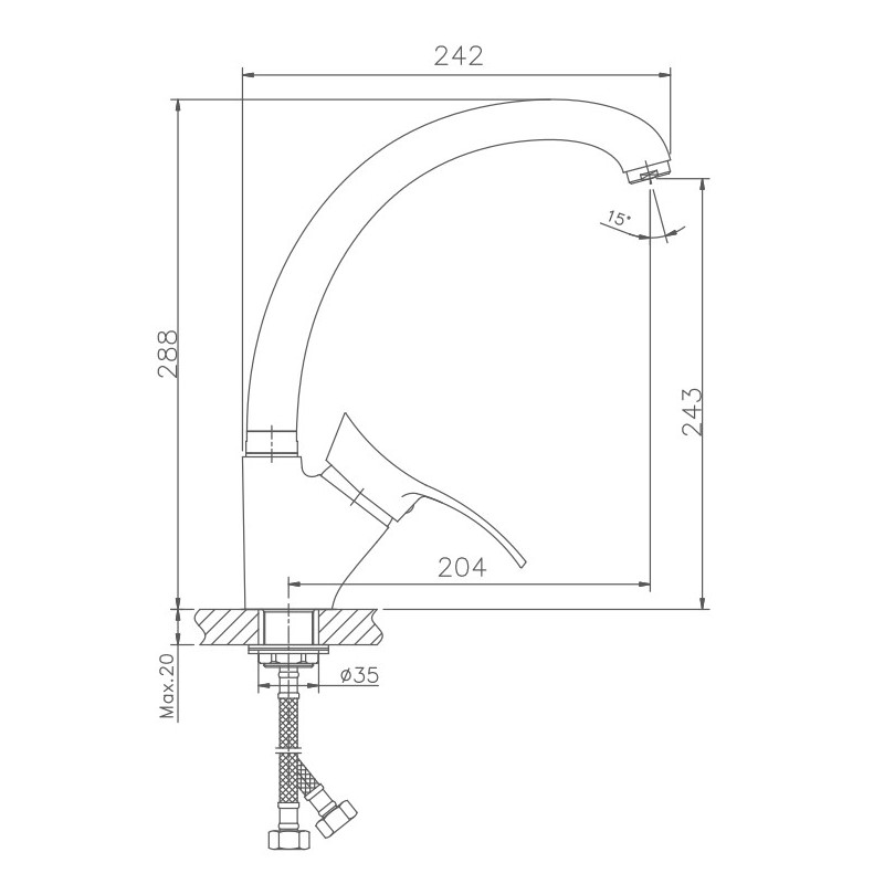 Смеситель для кухни бренда Haiba. Изготовлен из латуни. Картридж 35 мм. Укомплектован аэратором. Гибкая подводка 40 см. С поворотным изливом.