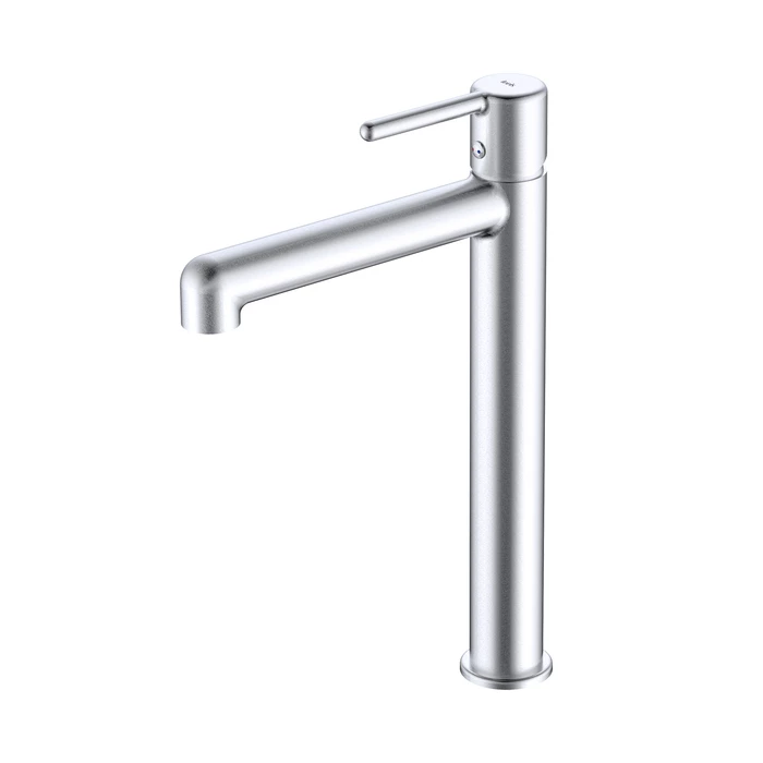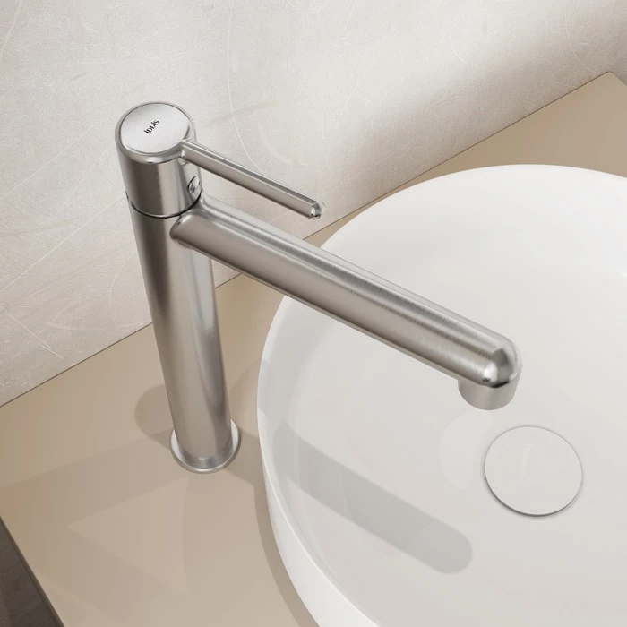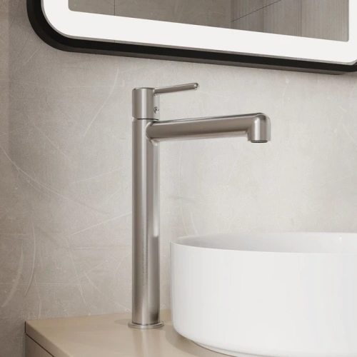 Стильный высокий смеситель для настольного умывальника удачно сочетает актуальный современный дизайн и новый трендовый оттенок матового хрома. Тонкая удлиненная ручка добавляет смесителю изящества и комфорт в управлении. Расстояние между ручкой и изливом увеличено для большего удобства.